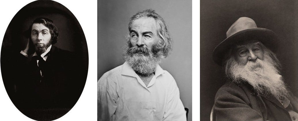 Left to right - Walt Whitman at age 28, Feb-May 1848, New Orleans’ Walt Whitman in 1862 at age 43, photo taken by Matthew Brady; Walt Whitman in 1887, age 68, photograph by George C. Cox; Wikimedia Commons.