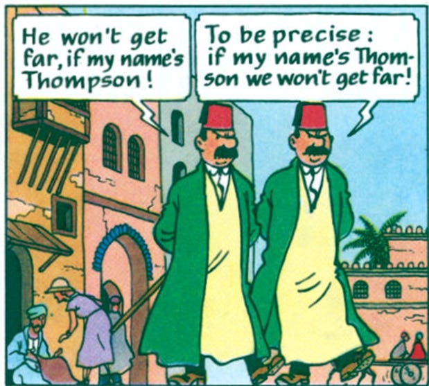 Hergé, Cigars of the Pharaoh: Adventures of Tintin, page 3, frame 13. Les Cigares du Pharaon, 1934, translated by Leslie Lonsdale-Cooper, Detectives Dupont and Dupond (in English Thompson and Thomson).