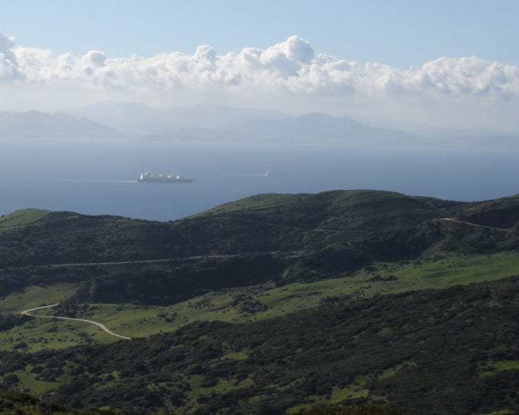 The Strait of Gibraltar, from the hills above Tarifa, Spain; Wikimedia Commons, 18 February 2007